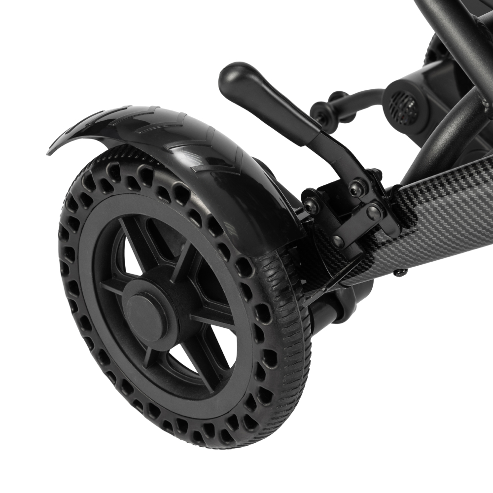 Литые шины и бесщеточные двигатели обеспечивают плавный ход, защиту от проколов и проходимость по поверхностям с легким бездорожьем.